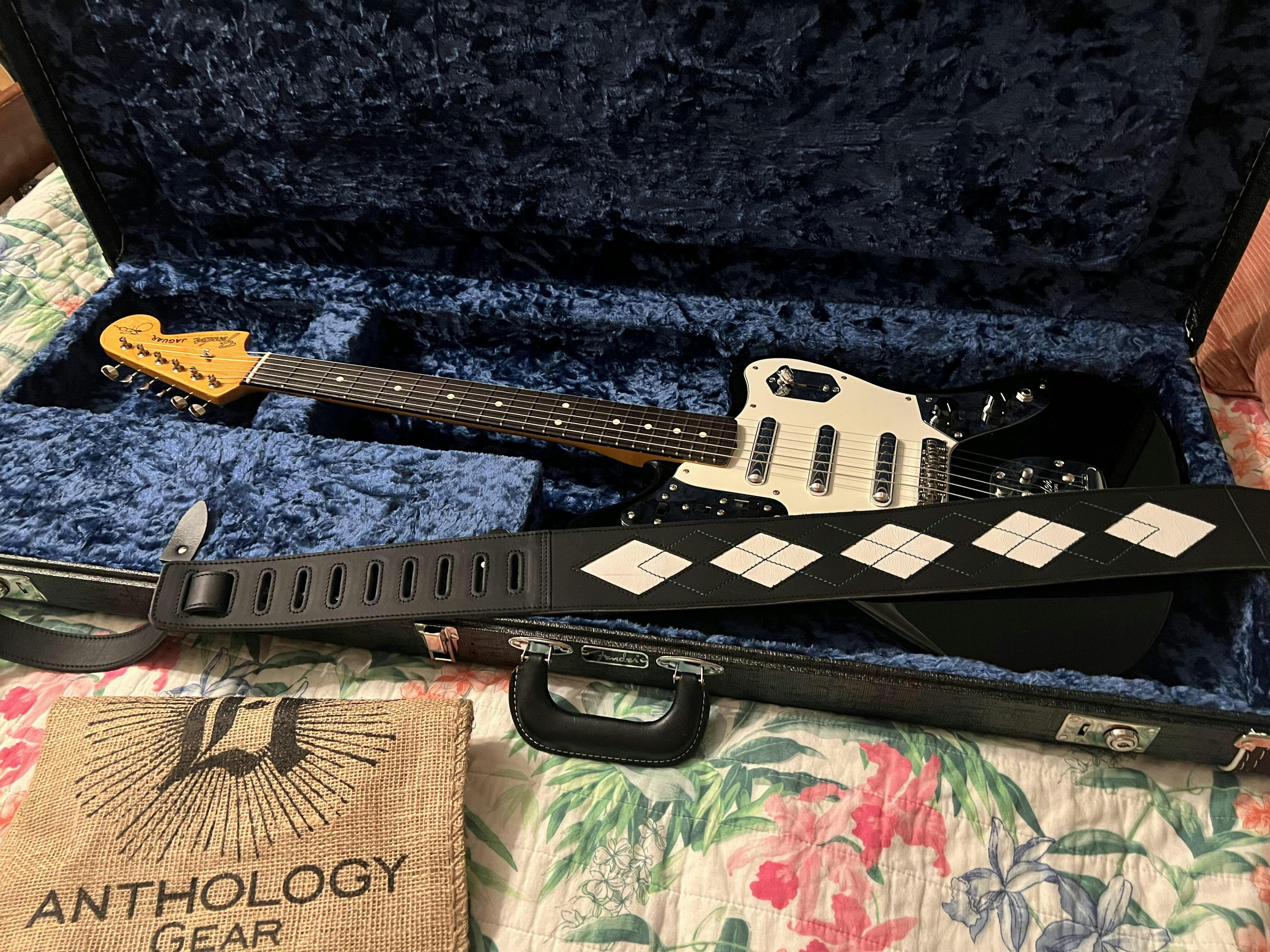 Everett - Carbon Black/White with Emerald Green Thread Argyle Leather Guitar Strap